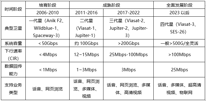 目前,国际上将高通量卫星发展划分为三个阶段。然后,根据容量大小和灵活性,将高通量卫星划分为四代: