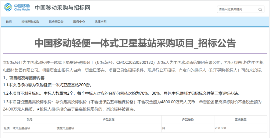 根据公告,他们要采购的,是一种名叫“轻便一体式卫星基站”的设备。项目采购的总预算是4800万元(不含税),一共需要200套。折算下来,单套设备最高投标限价金额为24万元(不含税)。