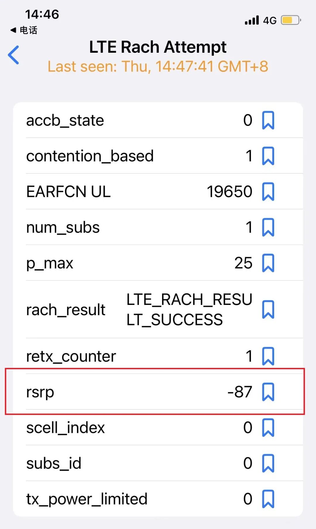 点击【4G】下面的【Rach Attempt】,可以查看4G信号强度的数值(rsrp,下图是-87):