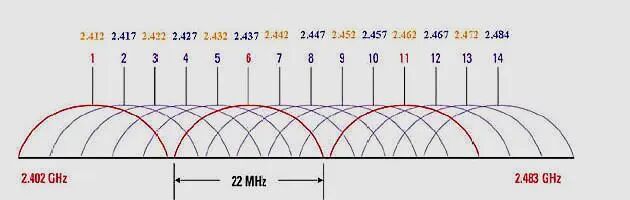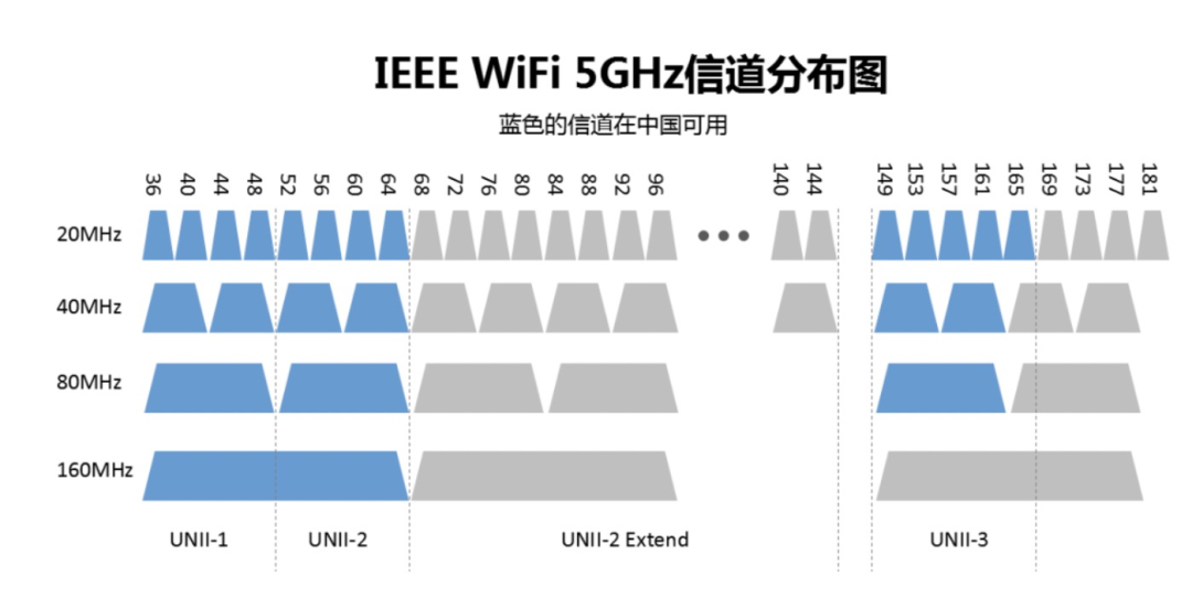 Wi-Fi分为2.4GHz频段和5GHz频段(还有6GHz频段,目前国内没开放)。两个频段的信道包括以下: