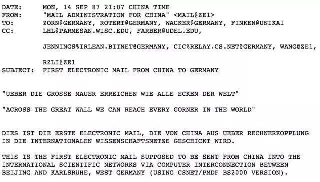 1987年9月20日,北京中国兵器工业计算机应用研究所的钱天白教授,发出了一封电子邮件,里面有一句话: