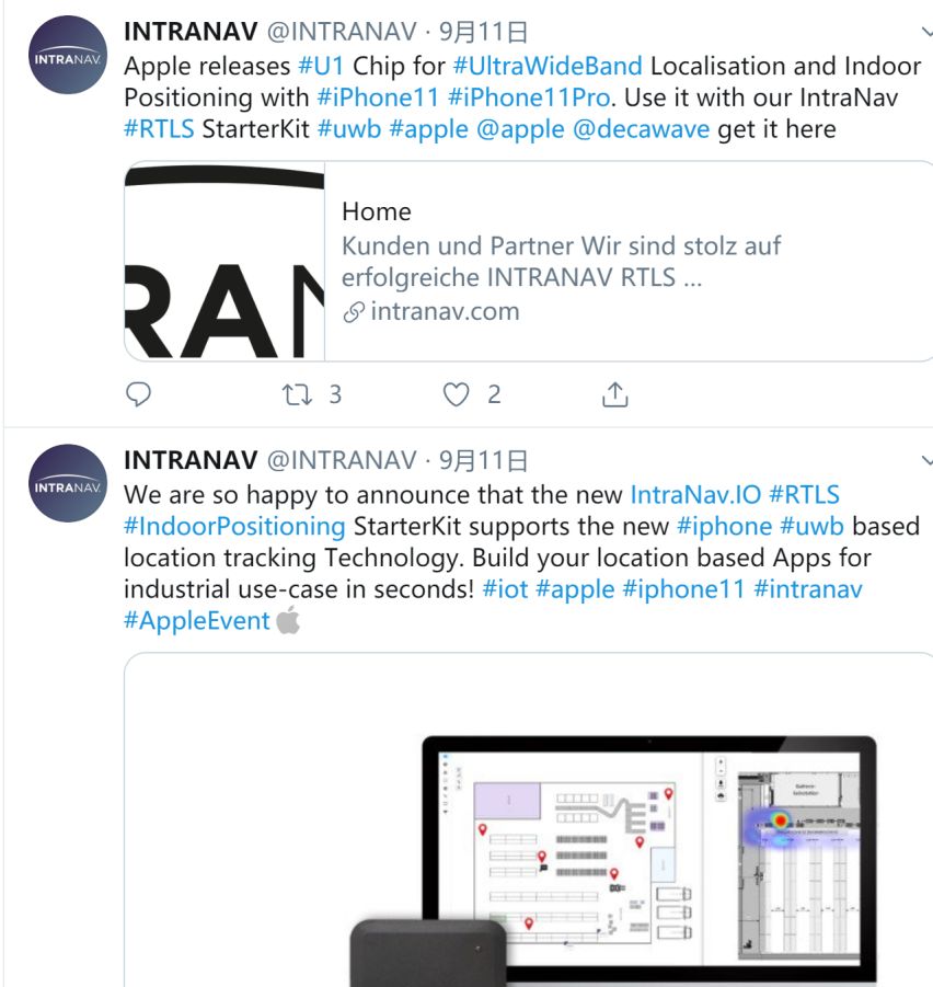 在苹果公司的产品发布会后,基于Decawave芯片DW1000的定位厂商INTRANAV连发两条推特,声称其套件支持与iPhone11的互操作,Decawave也转发了该推特。这说明,苹果U1有极大的可能支持IEEE 802.15.4。