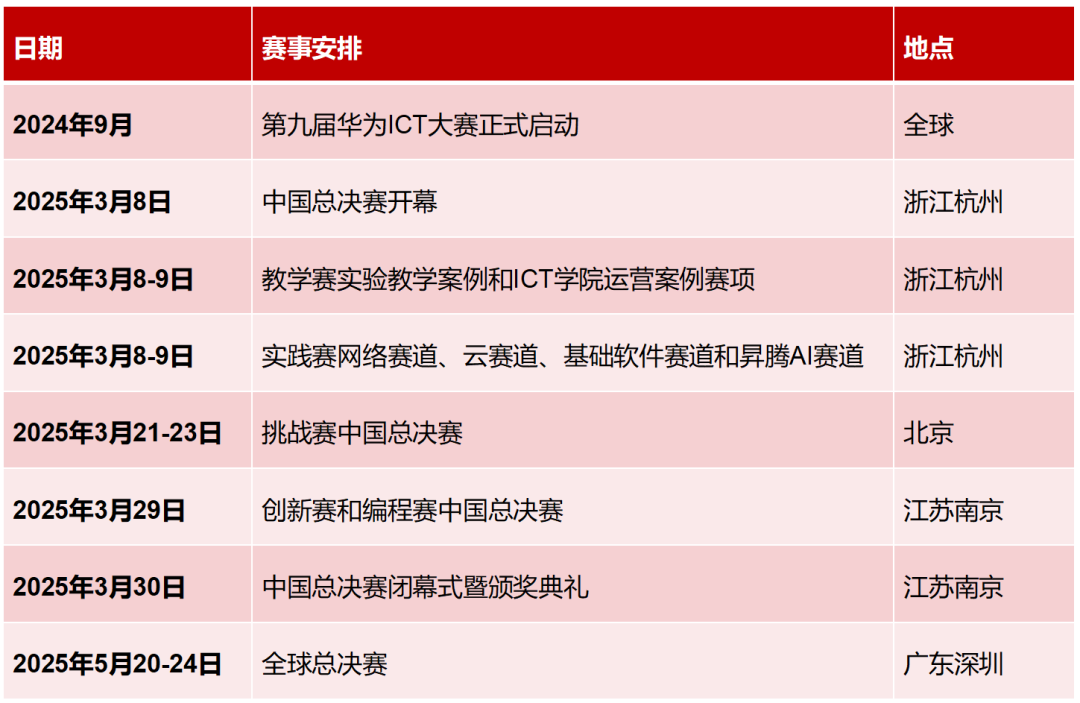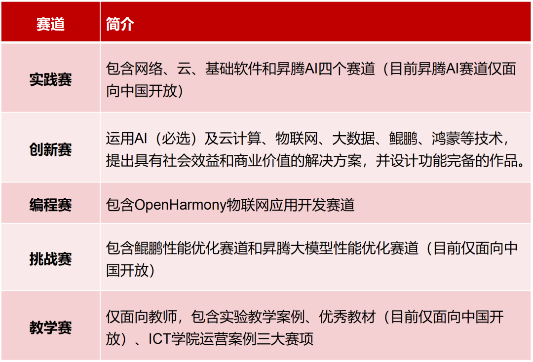 华为ICT大赛的赛道还挺丰富的。今年,他们在第八届大赛实践赛和创新赛的基础上,新增了编程赛、挑战赛及面向高校教师的教学赛。具体如下: