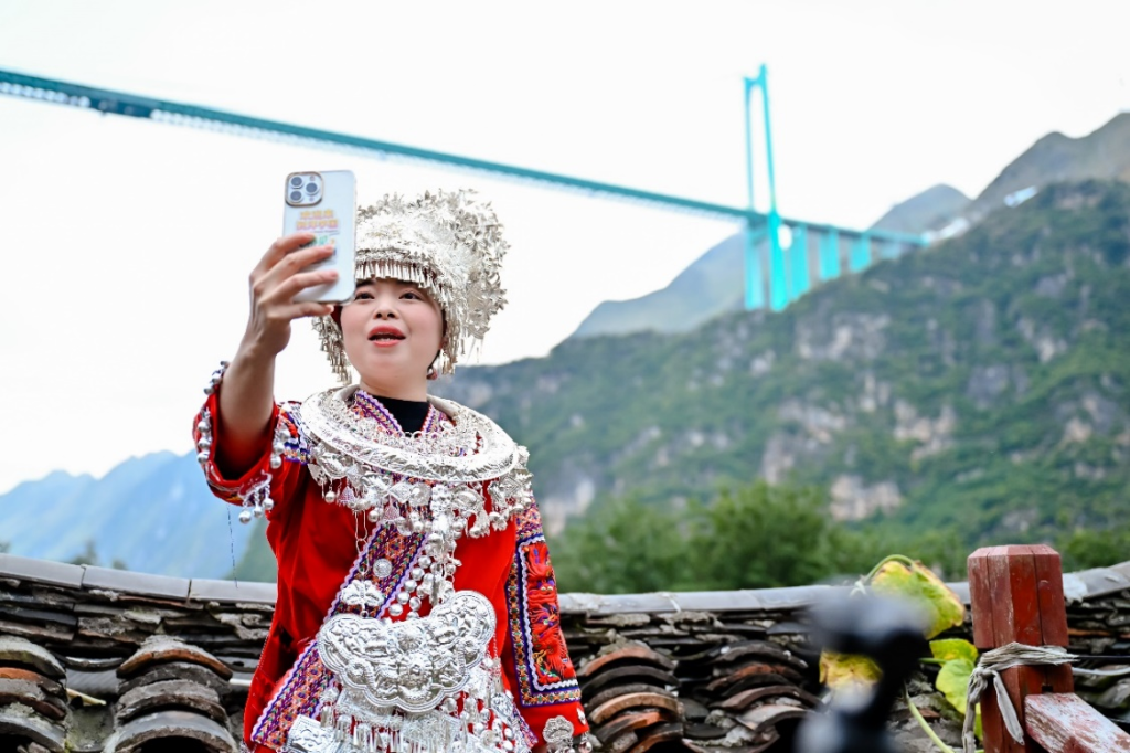 小花江村村民通过5G网络与网友分享大桥美景