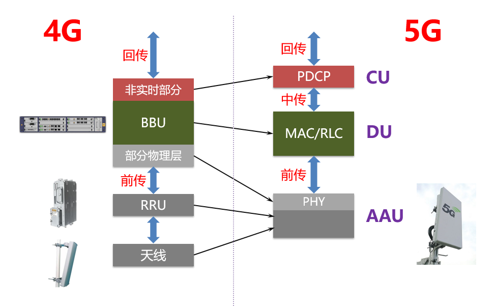 5G接入网相比4G,从原来的BBU+RRU+馈线+天线,变成了CU+DU+AAU。