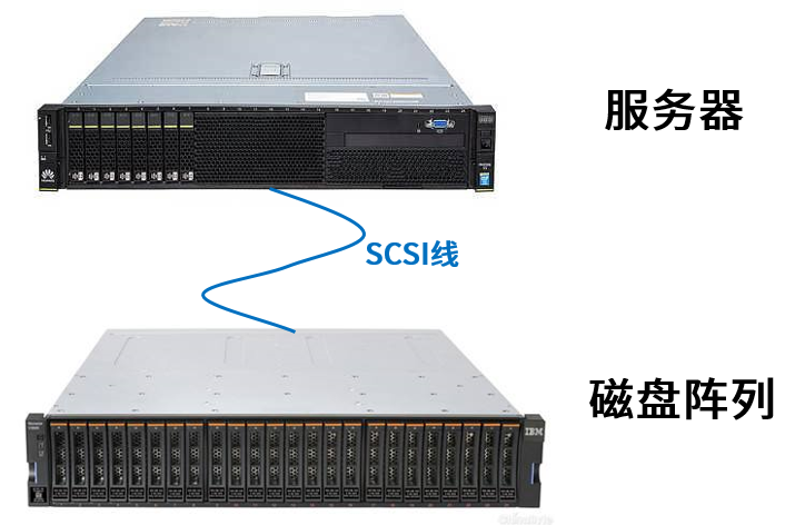 DAS直连式存储,一般是使用专用线缆(例如SCSI),与存储设备(例如磁盘阵列)进行直连。
