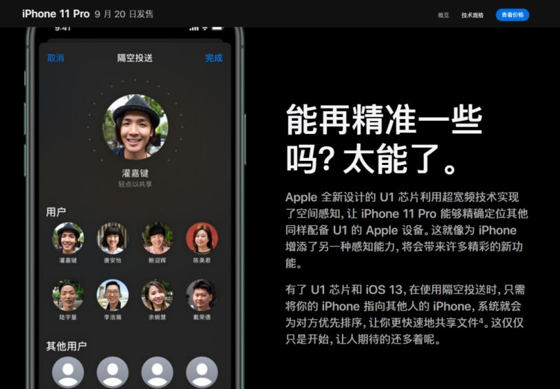当时,iPhone11全系搭载了支持UWB技术的U1芯片。