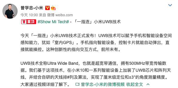昨日,小米高管曾学忠通过微博,正式发布了“一指连”UWB技术,引起全网的广泛关注。