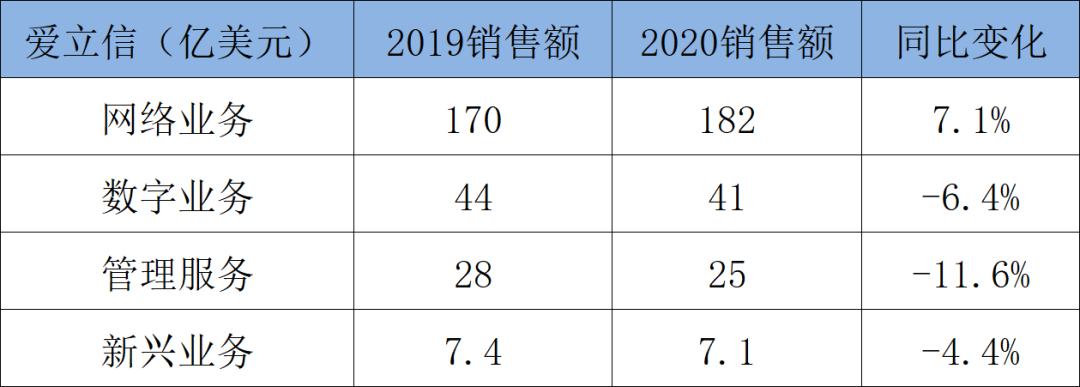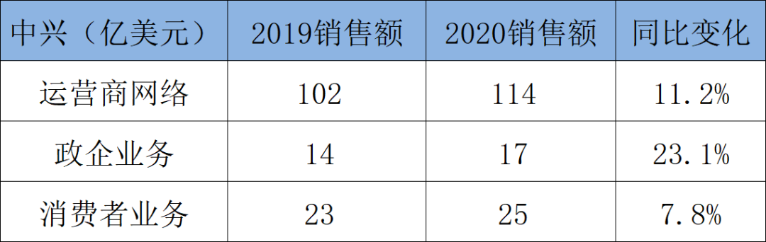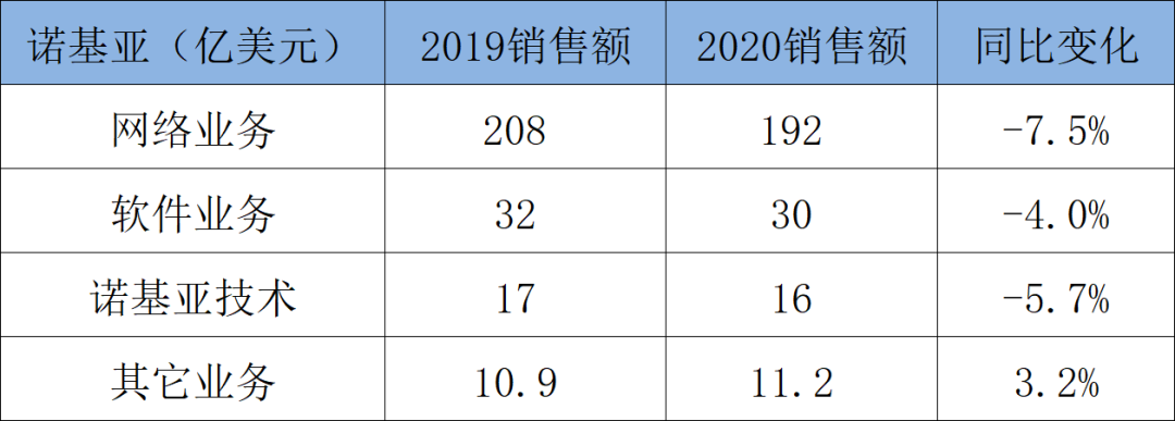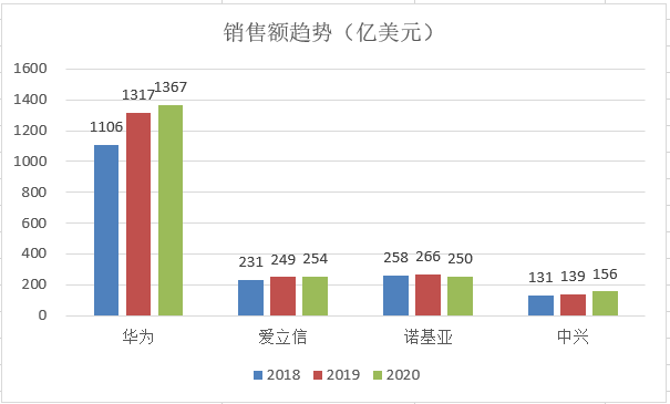 爱立信和中兴的销售额稳步增长,只有诺基亚在2020年同比下降6.2%。