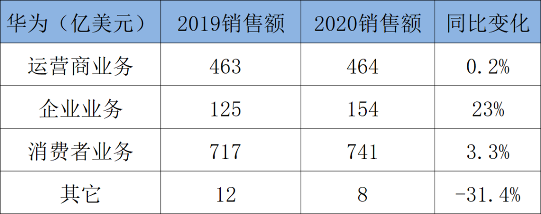 在美国的打压下,华为运营商业务勉强实现了0.2%的增长。而最为迅猛的消费者业务同比增长只有3.3%。