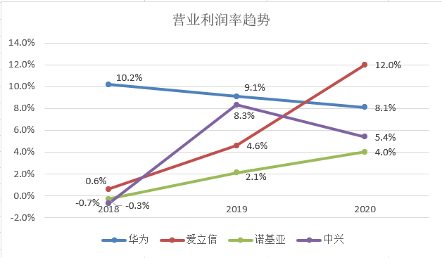 总的来看,华为的利润率三年来逐步下降,中兴的利润率在2020年有一定回落。而爱立信和诺基亚的利润率呈现出稳步上升的态势。